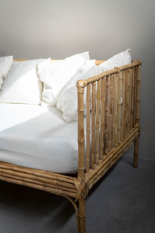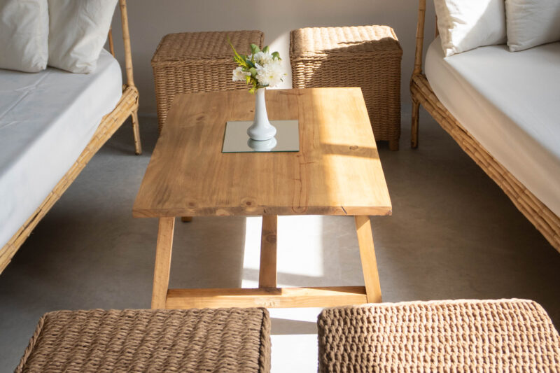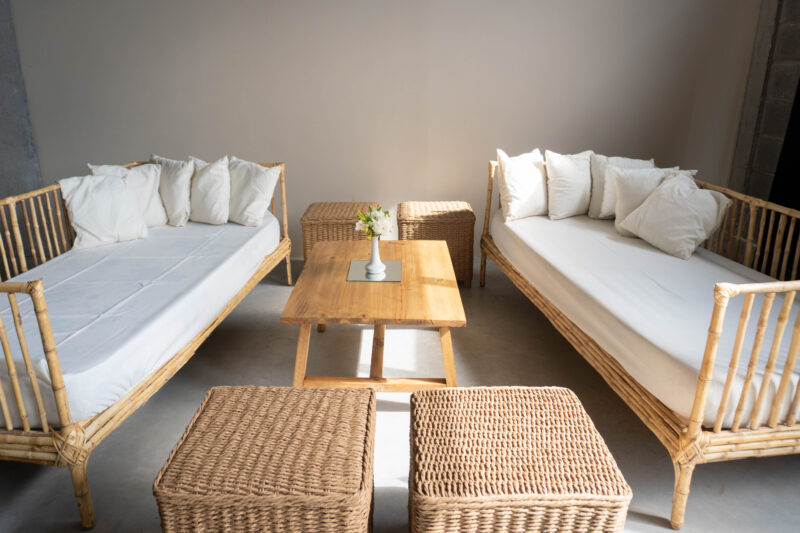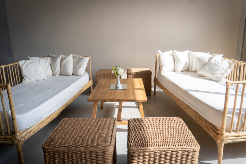 Living estilo Boho con camastros en caña y puff de fibras naturales craf